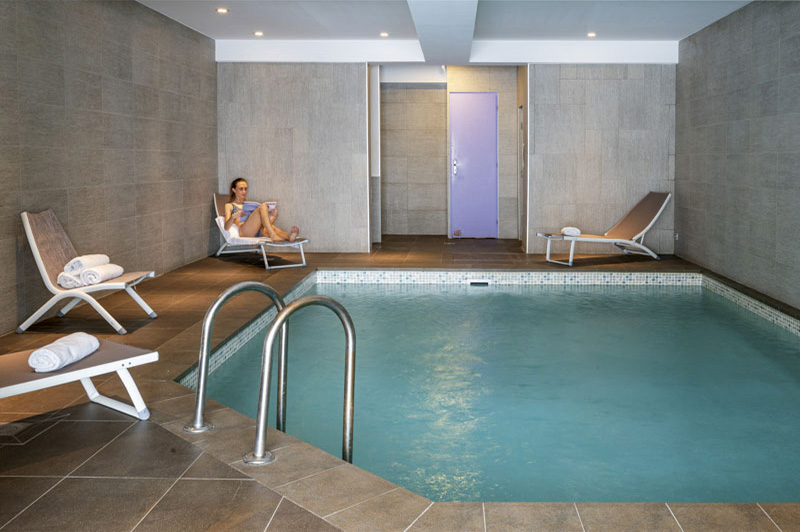 The hotel amenities include a wellness area with a heated indoor pool, as well as sauna and hammam baths, for guests to enjoy a peaceful and relaxing time out.