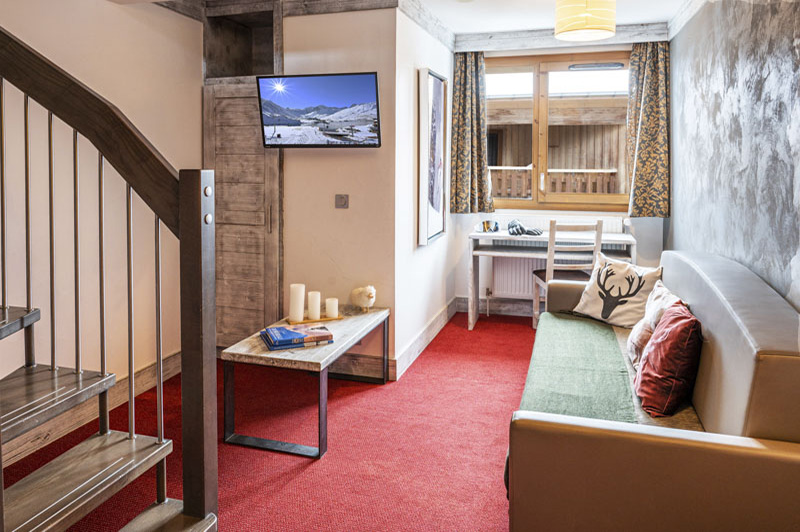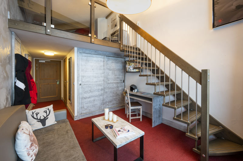 South facing suites located on the fifth floor. Composed of a sofa convertible into 2 beds of 90×200 in the living room and of a double 140×200 bed in the mezzanine (made in twin beds upon request), a Tv, a bathroom with bath or shower, and toilets. Some suites include a private balcony.