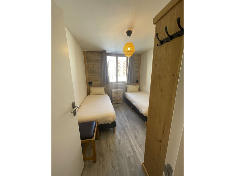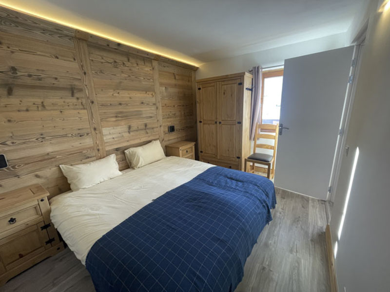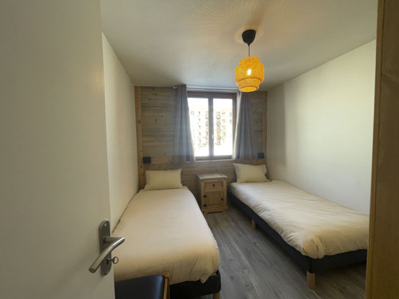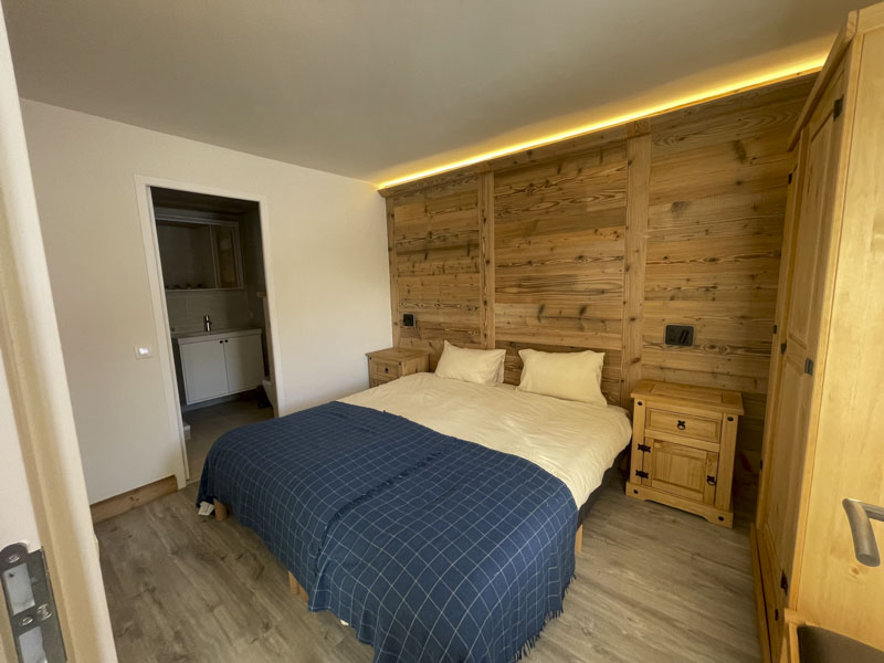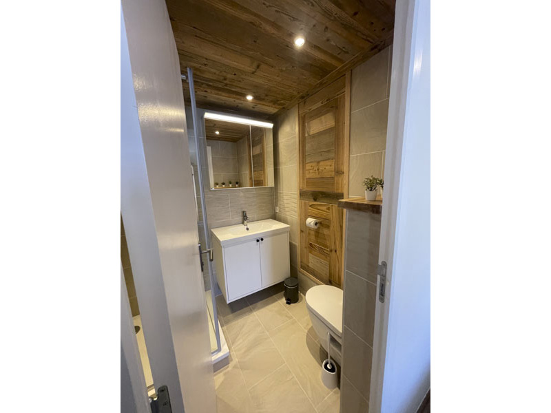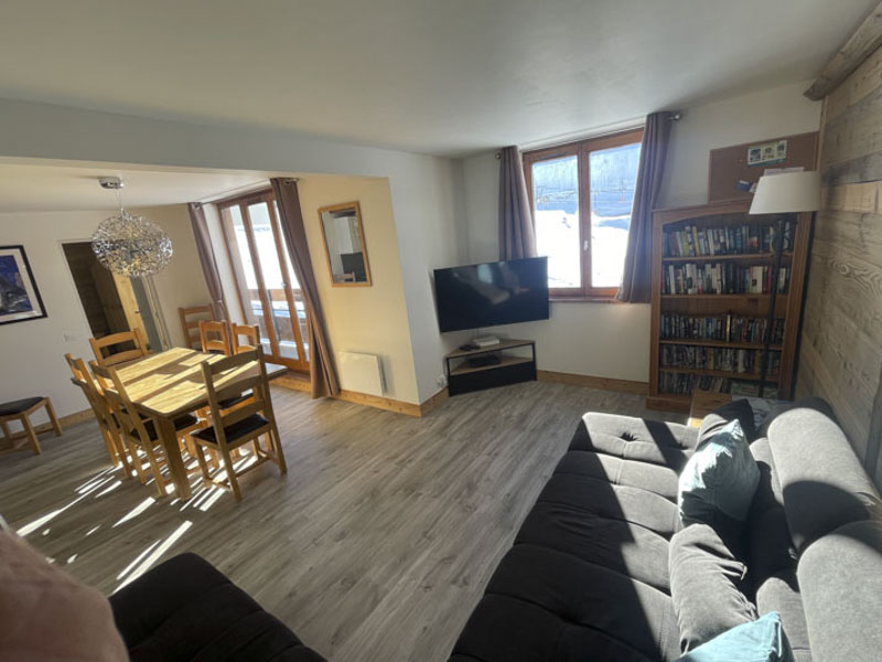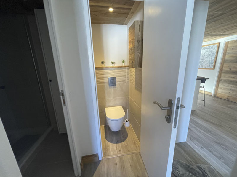 Number 15 is situated on the fourth floor, accessible by lift. It is a spacious and welcoming apartment with a large cosy living area, large solid wood dining table and modern kitchen. Leading off from the dining room is the master bedroom with en-suite, and at the opposite side of the apartment are two bedrooms, one with the two sets of bunks and one is a twin room, there is also a separate shower room and WC. There are two balconies, one east facing and one west facing, allowing views onto the nursery slope and up towards Tignes Le Lac.