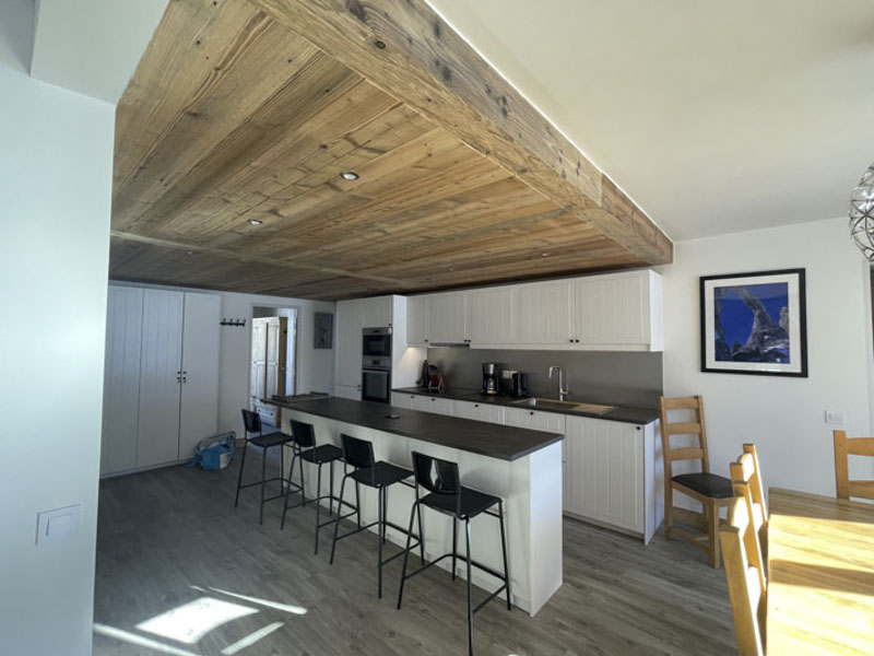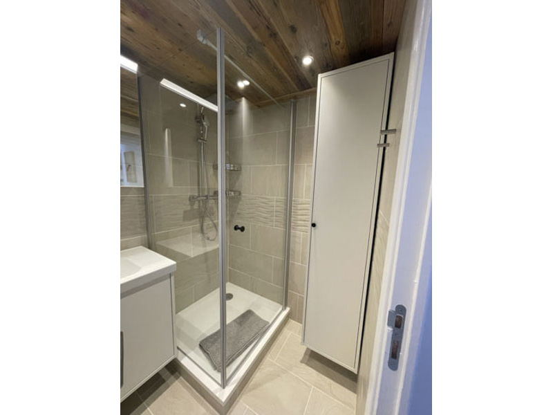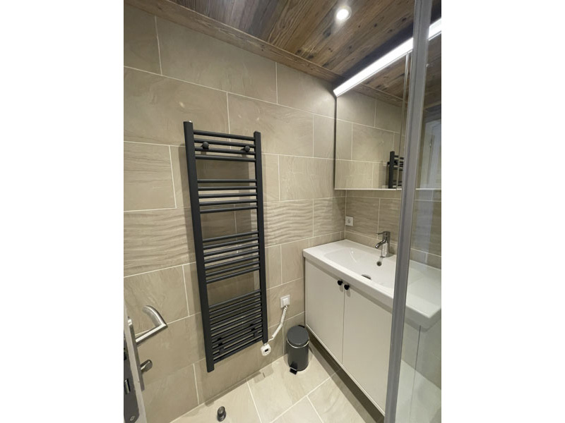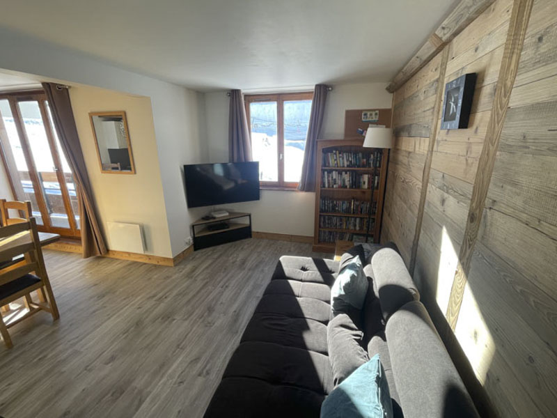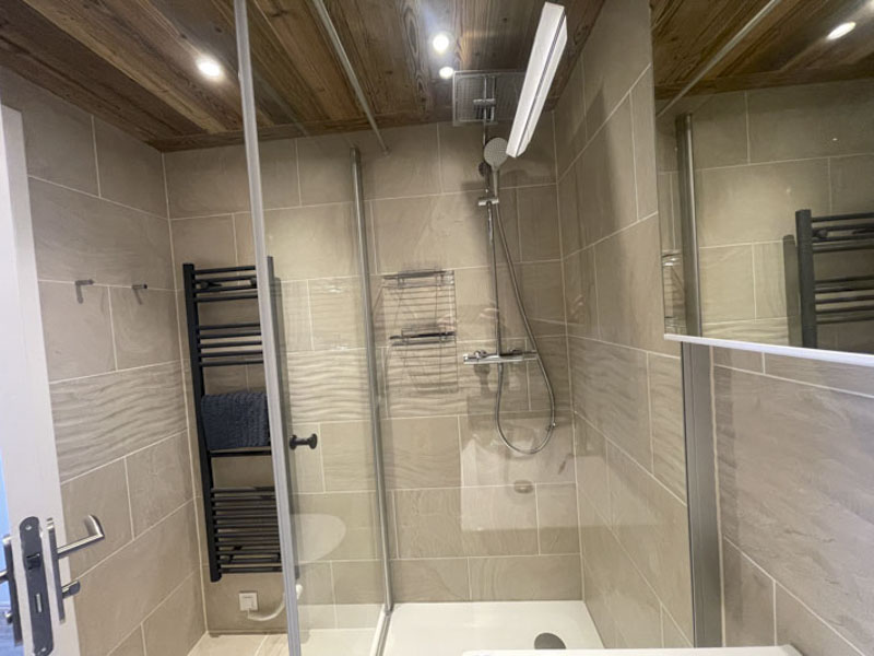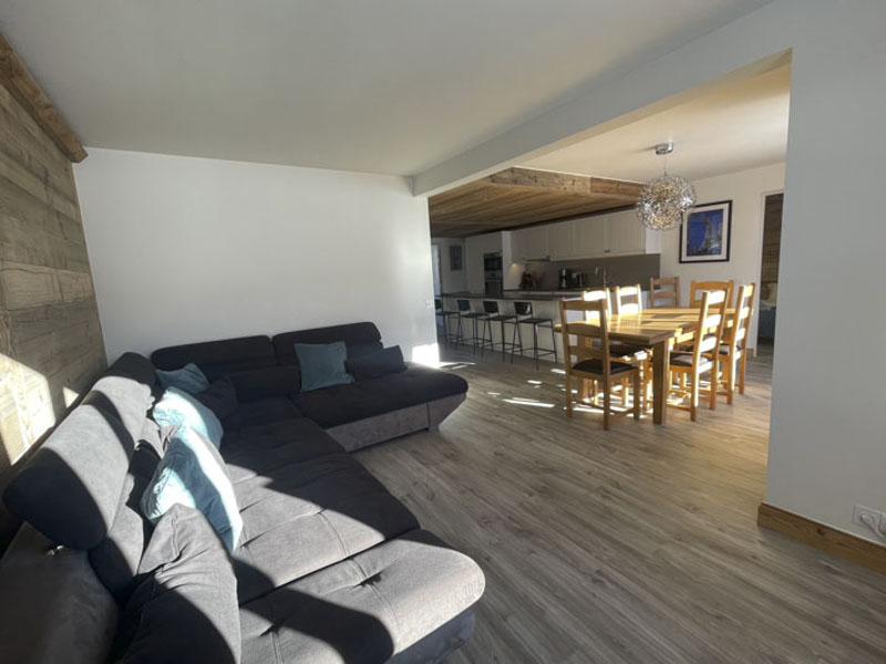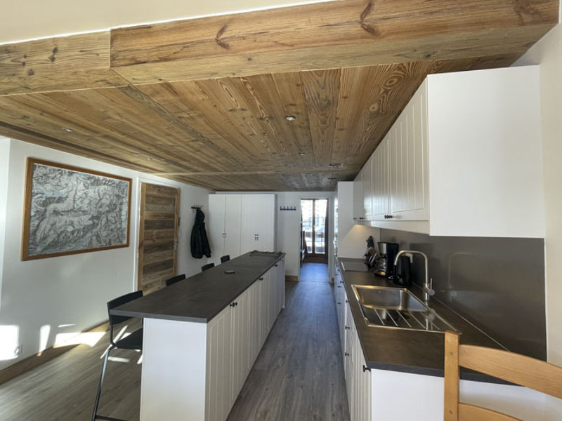 Number 15 is situated on the fourth floor, accessible by lift. It is a spacious and welcoming apartment with a large cosy living area, large solid wood dining table and modern kitchen. Leading off from the dining room is the master bedroom with en-suite, and at the opposite side of the apartment are two bedrooms, one with the two sets of bunks and one is a twin room, there is also a separate shower room and WC. There are two balconies, one east facing and one west facing, allowing views onto the nursery slope and up towards Tignes Le Lac.