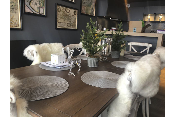 Comfortable living room with sofas and armchairs & large flat screen TV with access onto terrace, there is a separate dining area with a large dining table and 12 chairs, also leading onto the terrace with floor to ceiling windows. The terrace is well- furnished enabling you to dine al-fresco as well as relax around the fire-pit to gaze at those amazing views !